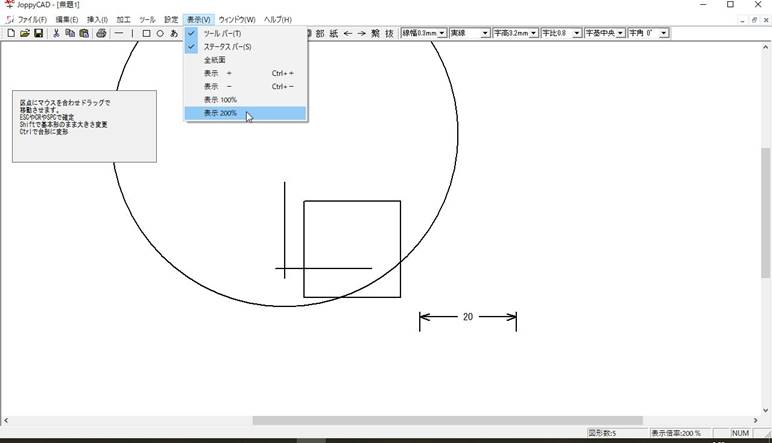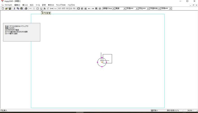 四角を移動したい場合、選択されているのが丸だから、一旦、確定させる必要がある。お気付きだろうか、案内にあります。そこには「ESCやCRやSPCで確定」とあります。つまり、ESCキー(あるいはスペースキー、あるいはリターンキー)を押します。