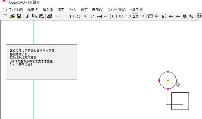 お気付きだろうか、案内にあります。例えば円のみを選択すると、「Shiftで基本形のまま大きさ変更、Ctrlで楕円に変形」と案内があります。
